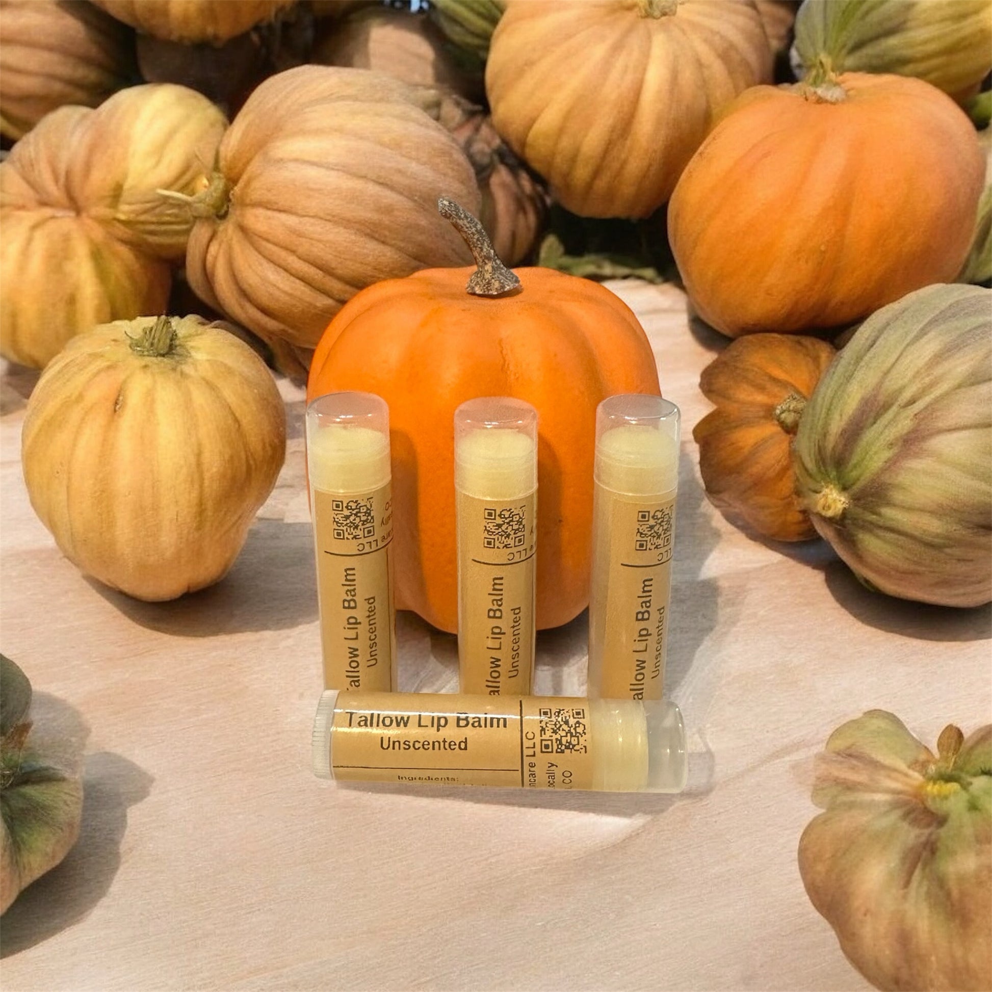 Our lip balm is made with 100% Grass Fed Tallow, Organic Beeswax, Organic Raw Honey, and Organic Vitamin E Oil. The scents for the lip balm are unscented or vanilla.